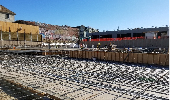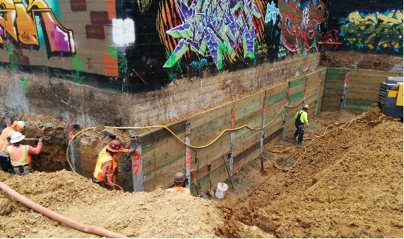During the geotechnical investigation and historical data review, Rockridge Geotechnical (RG) identified that much of the site was covered by fill with an area up to about 15 feet thick where a former building with a basement was located. Because the proposed basement level was near the historic high groundwater level, a mat foundation was recommended to simplify the detailing of waterproofing and to provide suitable total and differential settlement for both static and seismic conditions. The excavation was temporarily supported by soldier piles with tiebacks, and the adjacent building to the east was underpinned with hand-excavated piers.